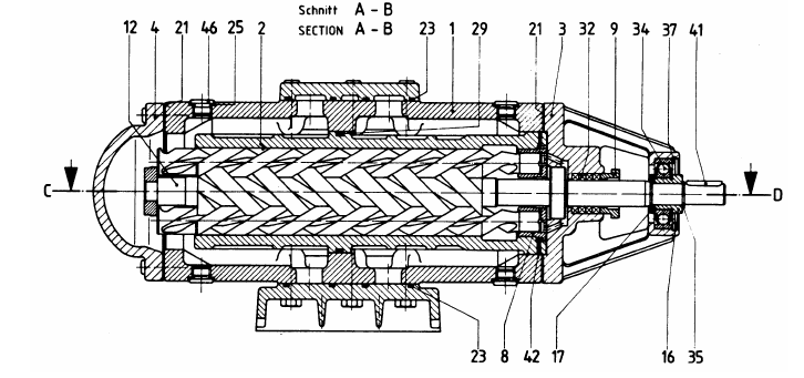 ◆U12.1結(jié)構(gòu)圖 ◆E6.7結(jié)構(gòu)圖(940轉(zhuǎn)速以下) ◆E6.7結(jié)構(gòu)圖(940以上) ◆E15結(jié)構(gòu)圖(940以下) ◆K2結(jié)構(gòu)圖 ●U12.1結(jié)構(gòu)圖 1.泵體 2.襯套 8.平衡套 12.主桿 13從桿 34 軸承 83 機械密封 ●SM三螺桿泵E6.7結(jié)構(gòu)圖(940轉(zhuǎn)速以下) ●E6.7結(jié)構(gòu)圖(940以上)