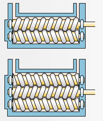 雙螺桿泵有密封和非密封型兩類。 密封型 由漸開線和擺線組合而成 其 η v 略遜于擺線嚙合的螺桿泵 但能使工藝簡化,成本降低。 非密封型 采用兩根 D 相同、單頭、定螺距、矩形或梯形齒形的螺桿 不能形成完全封閉的嚙合線,屬于非密封型螺桿泵。 為減少漏泄,需增加導(dǎo)程數(shù),又要限制螺桿的長度,故不得不減小螺旋的升角,從而導(dǎo)致螺桿自鎖。 因此,傳遞扭矩需靠齒輪,主動(dòng)和從動(dòng)螺桿彼此不直接接觸。 二、雙螺桿泵的工作原理